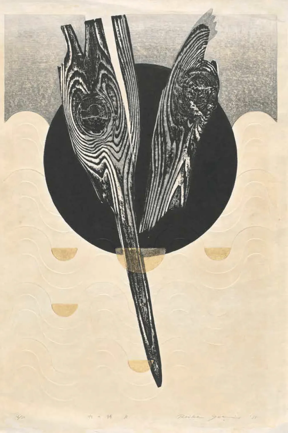 Iwami is considered the first Japanese woman print artist “to achieve the same status and worldwide recognition as male artists,” according to Mary and Norman Tolman in Collecting Modern Japanese Prints, Then & Now, with her powerful compositions; simple, abstract designs; and embossed and textured surfaces that emerge through limited colours. Besides pursuing her own artistic expression, Iwami was instrumental in founding the Joryū Hanga Kyōkai (Women’s Print Association) in 1956, the first of its kind and one that played a decisive role in bringing talented women printmakers to the forefront. These artists’ innovative, modernistic styles pushed the boundaries of Japan’s long printmaking tradition.