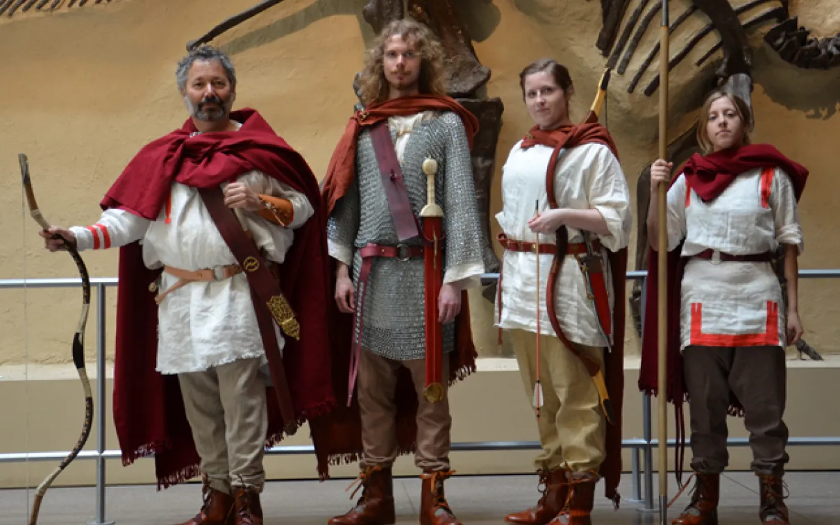 Ancient Rome & Greece Weekend is over, and I thought I would show you the results of my attempt to create a recreation, re-enactment, or impression of a soldier from Dura-Europos (so this is not really one of the original IV, so to speak, hence it is V of IV). In the group above you can see me on the left, with members of the University of Toronto's Hart House Archery Club, who collectively constitute the ROM's 3rd century Roman army (or ROMan army - it being the ROM, we are posing in front of a dinosaur). The others are wearing the tunics I had made last year for a similar weekend event, for which I asked Gwen Nowrick of Black Swan/Historic Enterprises to make me something that looked like the tunics worn by Terentius and his men. This year *I* am wearing the reproduction of an actual tunic from the period. The tunic is much longer, it would go down to my ankles unbelted, but it passes pretty well as a short tunic (see the previous blog to see how!).