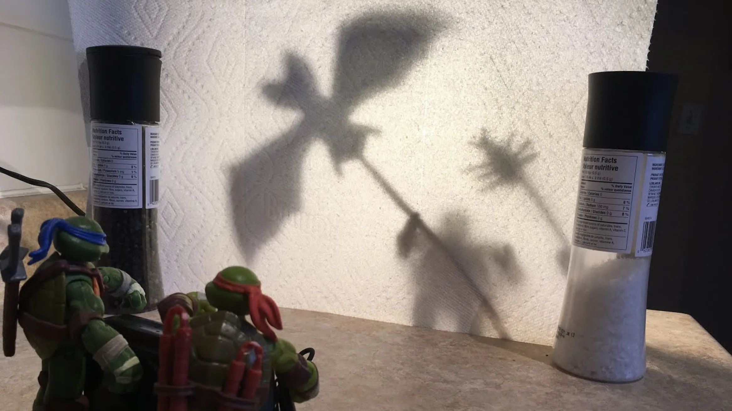 - Créez votre scène en plaçant une lumière derrière vos ombres chinoises et un écran devant elles. Les figurines de notre exemple utilisent comme écran une serviette en papier placée entre deux moulins à sel et à poivre. Un drap de lit tendu entre deux chaises fait tout aussi bien l'affaire !