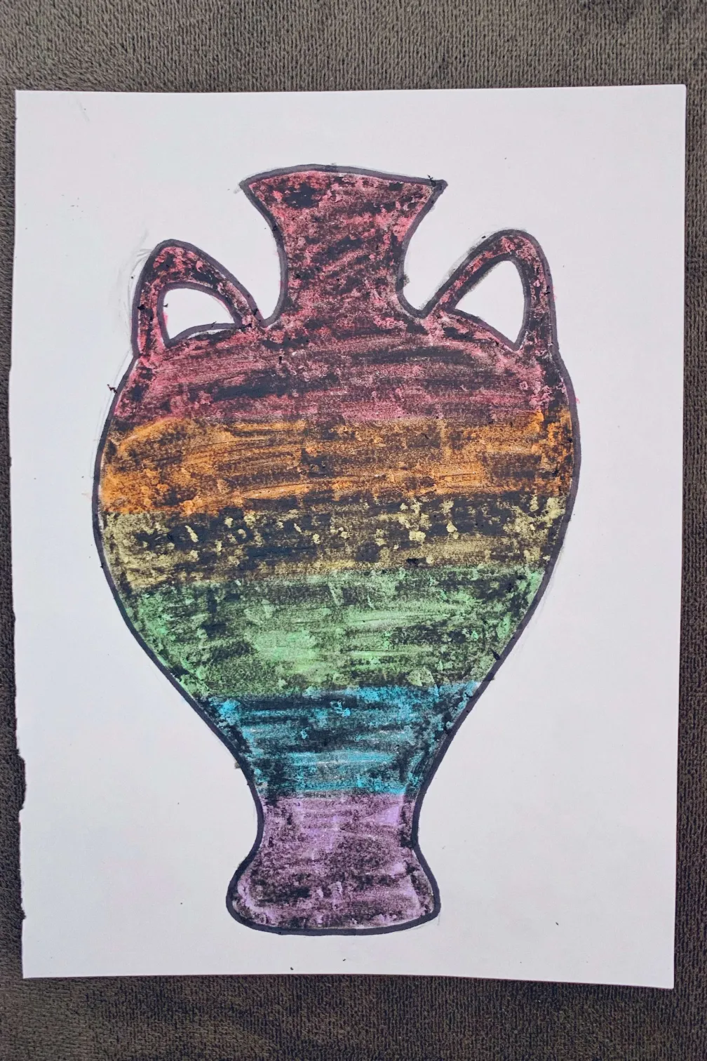 3. Utilise ensuite ton crayon noir pour colorier le dessus. Commencez par des lignes horizontales. Puis, une fois que c'est fait, faites des lignes verticales. Cela vous permettra de couvrir toute la surface de l'amphore.