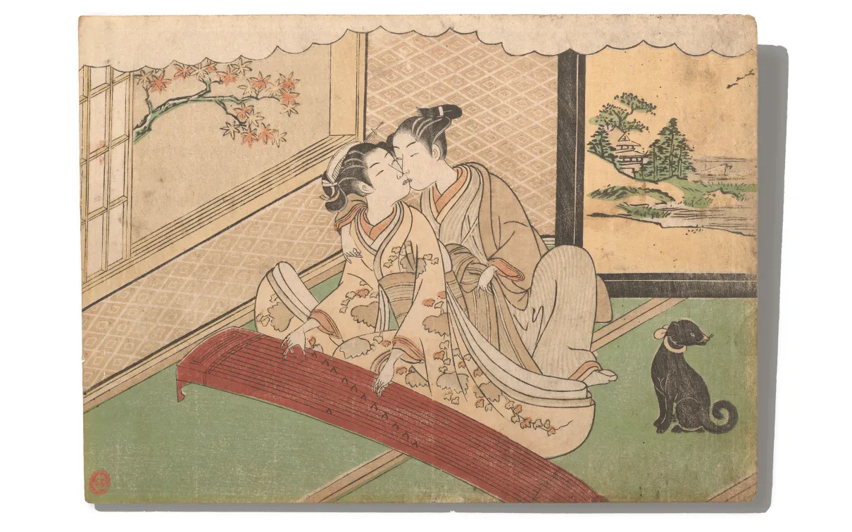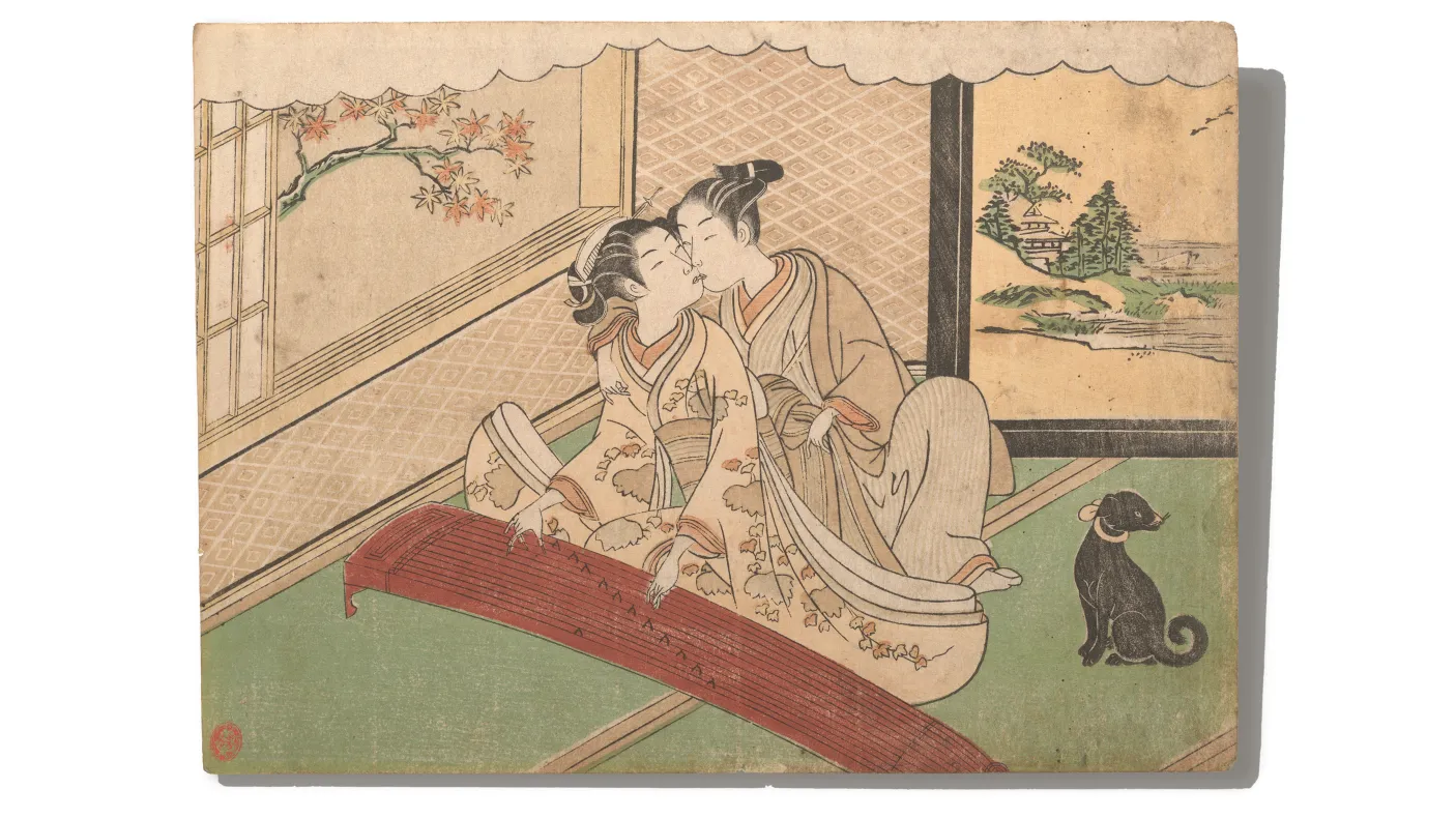 Crédit photo : Suzuki Harunobu, Deux amoureux : un wakashu et une jeune femme s'embrassent, 1768-1770. Gravure sur bois en sept couleurs sur papier. Collection Sir Edmund Walker (Photo : Paul Eekhoff, © ROM)