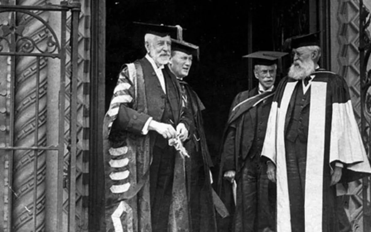 Sir William Meredith, chancelier de l'Université de Toronto ; Sir Robert Falconer, président de l'Université de Toronto ; Dr James Brebner, registraire de l'Université de Toronto ; Sir Edmund Walker, président du conseil d'administration (1912). (De gauche à droite)
