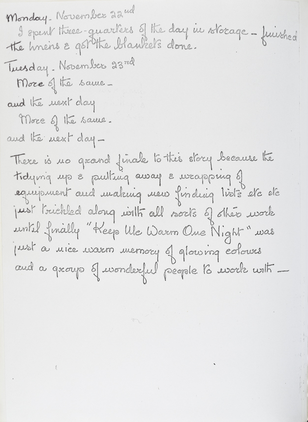 Il n'y a pas de grand final à cette histoire parce que le rangement, le stockage et l'emballage du matériel, l'établissement de nouvelles listes de recherche, etc., etc. se sont déroulés au compte-gouttes, avec toutes sortes d'autres tâches, jusqu'à ce que "Keep Me Warm One Night" ne soit plus qu'un beau souvenir chaleureux de couleurs éclatantes et d'un groupe de personnes merveilleuses avec qui travailler...