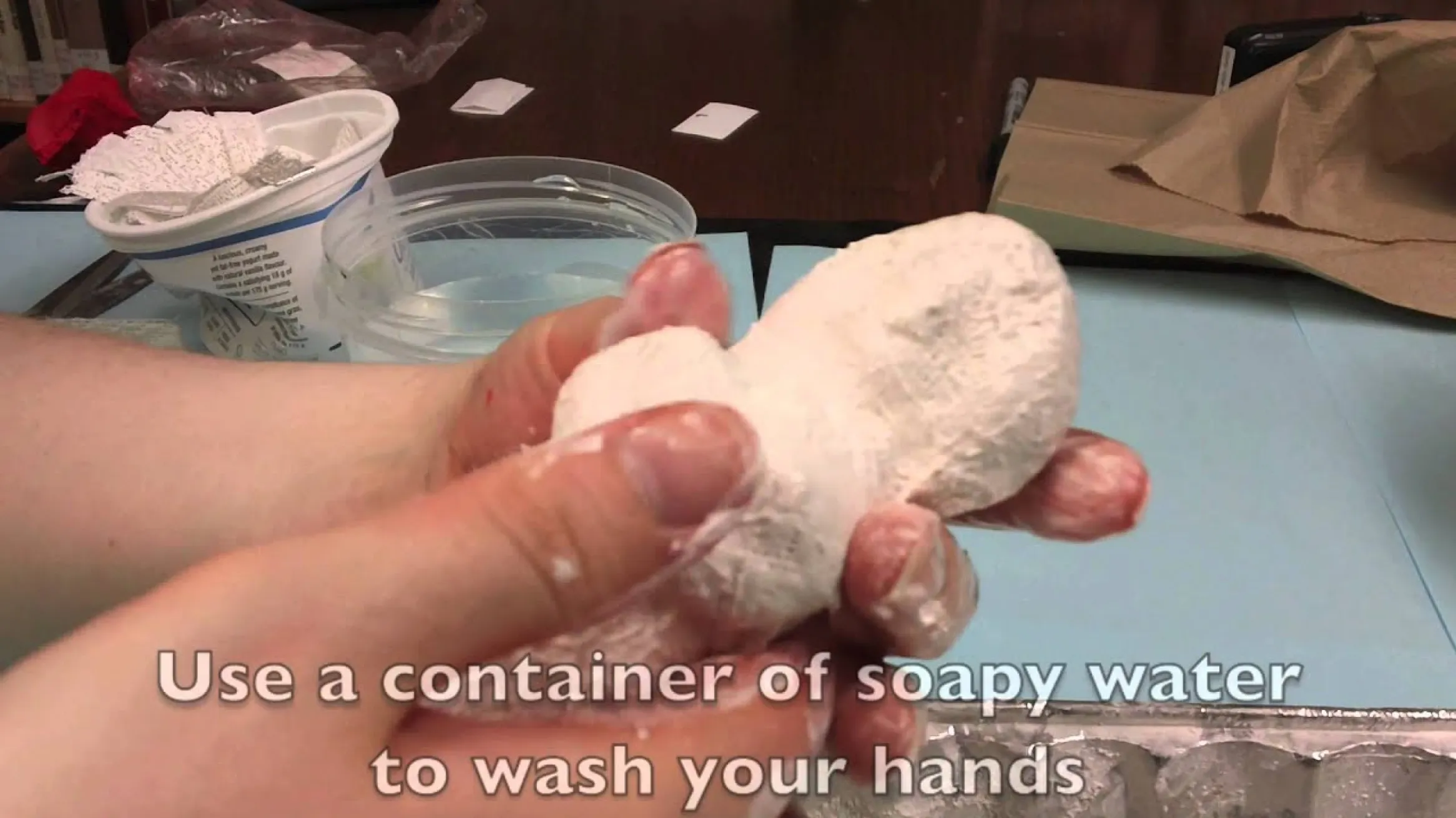 Have a bucket full of soapy water and a disposable cloth on hand to clean your hands with. Wipe the excess plaster from your hands before washing.