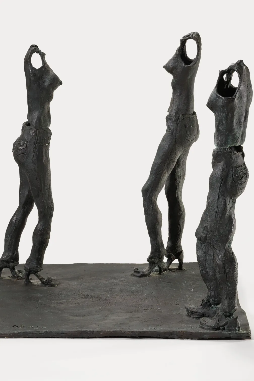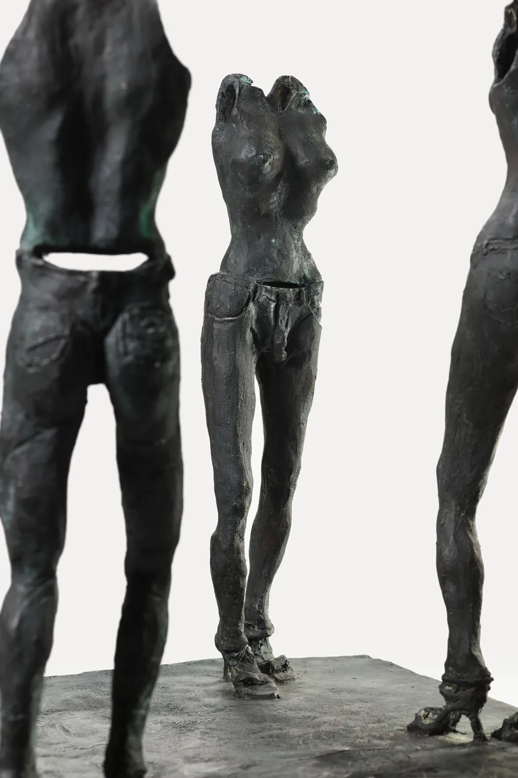 One of the pieces, Who’s There? (2011), features three human figures standing topless but wearing jeans and shoes. The sculpture was cast after Lee’s visit to a Levi’s factory in Costa Rica. While conversing with young workers, Lee learned that they were paid just $1 per hour to make jeans, while it took them more than three months of wages to save enough to buy a pair of the very same Levi’s jeans they worked on daily. Stunned by this conversation, Lee created the piece, which depicts one female, one male, and one cross[1]gender figure. Lee also created red jeans out of papier mâché and staged a performance in which he burned the jeans at his winter home in Mexico, surrounded by friends. The sculpture and performance bring into focus global wealth disparity, the exploitation of child labour in the global fashion industry, and our daily complicity as consumers.