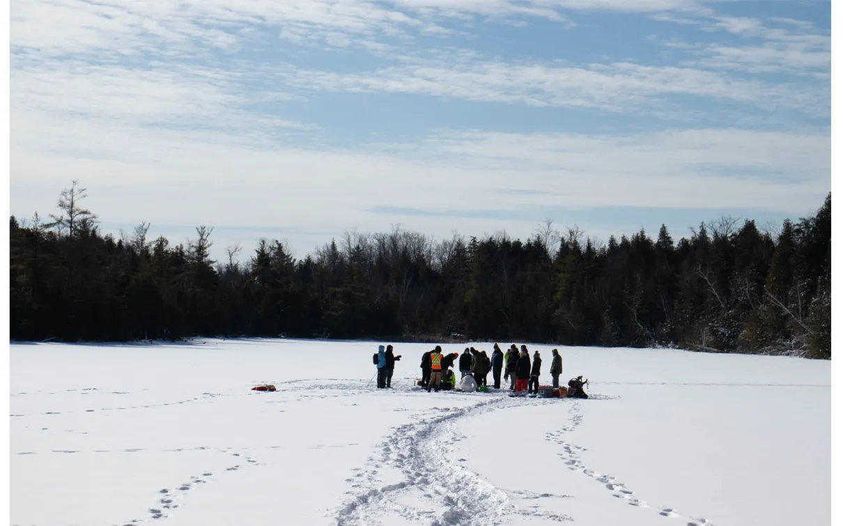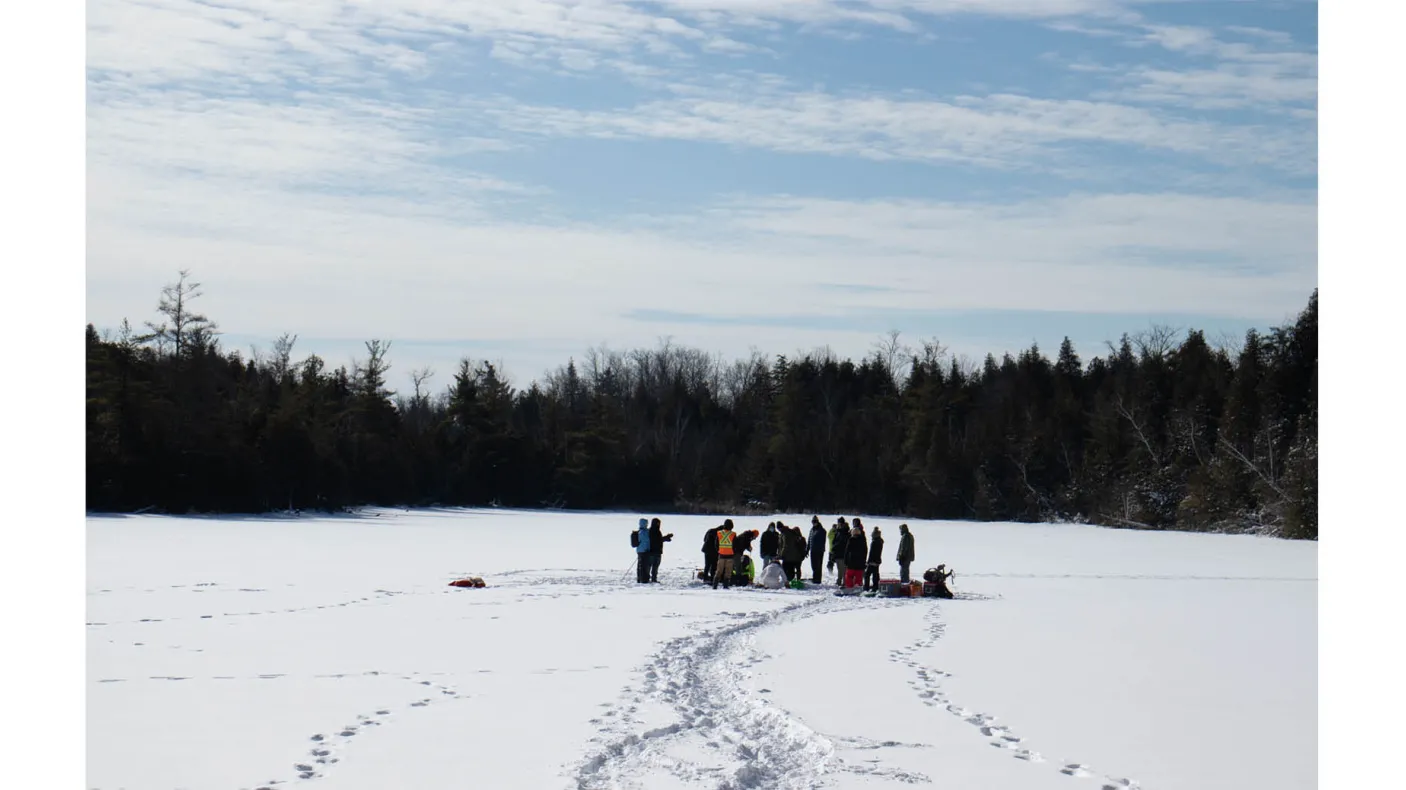 The day of the last coring of Crawford Lake was bitterly cold. A small crowd stood on the ice, which was almost half a metre thick. They braced against the chill as Monica Garvie, an Anishinaabe PhD candidate from northern Ontario, knelt beside a chainsaw-cut hole. She performed a ceremony and laid cedar branches on the site. “To care for the lake during an extractive process is just showing our respect and ensuring we’re maintaining a good relationship with the lake,” Garvie says. “For me, it was very meaningful to be able to be there and do ceremony.”