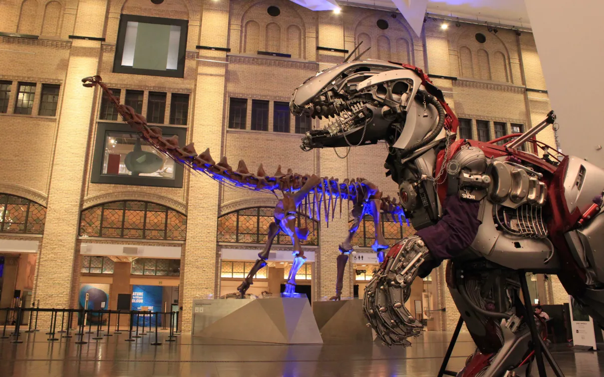 The Recylosaur is on display in the Samuel Hall Currelly Gallery in ROM, courtesy of JUNKO, the Toronto Raptors, and GFL Environmental Inc.
