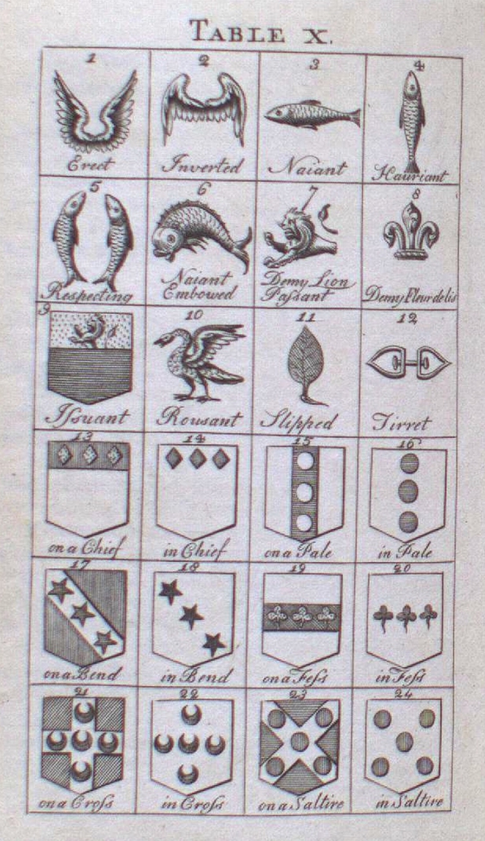 Just as arms proclaimed rank to those who saw them, the elements in the arms might also be ranked. When Sir Amias and Sir Eustace rated the colours, gold was considered the most prestigious. Many animals make appearances in arms. The lion and eagle are common, but one might also find a dragon, a duck or even a welke. One book from 1842, is entirely devoted to the Heraldry of Fish.