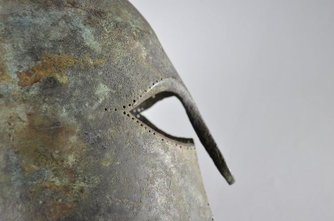 The Nugent Thermopylae helmet (ROM no. 926.19.4 - ROM Photography) of the "Chalcidian" type, a type used by Spartan hoplites.